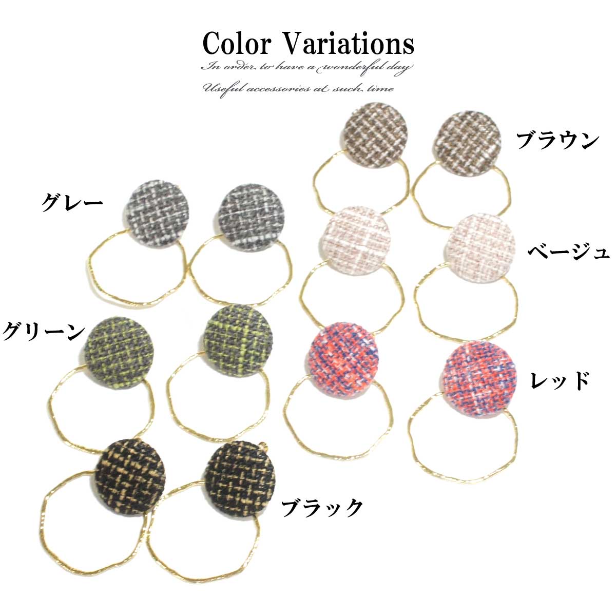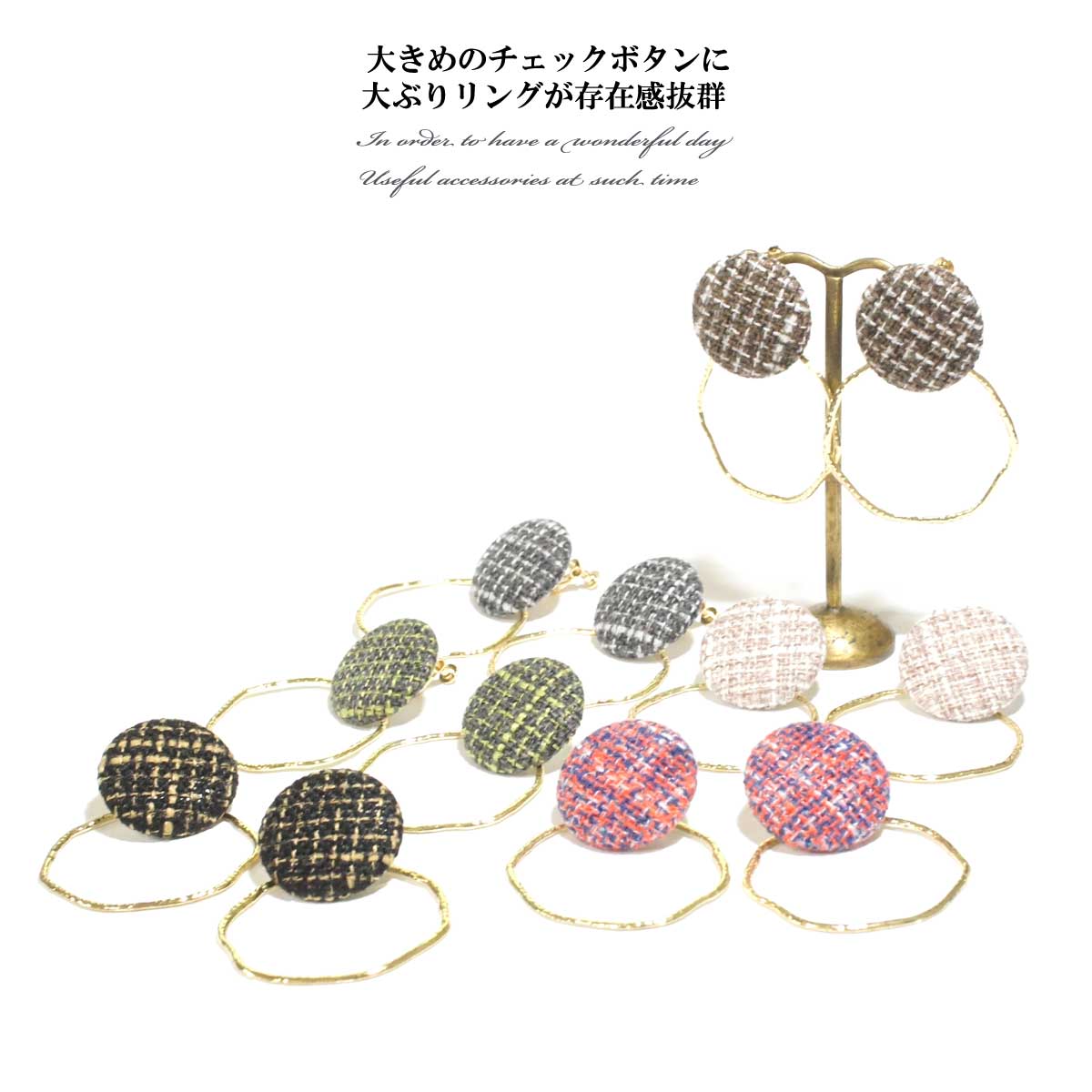 秋冬のチェックボタンに大きめリングのビッグイヤリング! 缶バッジの様な大きめのチェックボタンに 叩いた様なラフなデザインの大きめリングがアクセント。